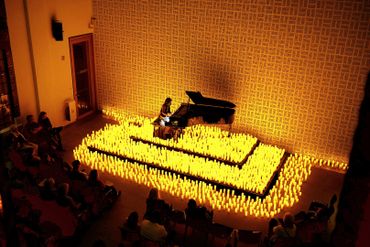 Tausende Kerzen tauchen die Kulturschmiede in warmes Licht und schaffen eine magische Kulisse für ein unvergessliches Klavierkonzert.